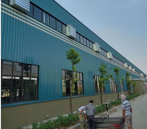 如果没有足够的门窗通风,应打开墙洞进行负压通风,以保证厂房所需风量;风机应安装在距地面1米~1.5米的位置,使对流处于适当的高度,并保证风机水幕系统营造清爽的环境。框架结构在安装位置稳定,强度能支撑整个设备和维修人员的重量。